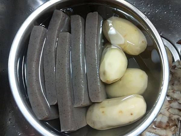 蒟蒻拆開後洗乾淨後 泡醋水(因蒟蒻是泡鹼水..鹼味很重..泡醋水鹼味就沒啦) 馬鈴薯削皮後泡水(馬鈴薯含澱粉 把澱粉洗掉 煮才不會糊掉)
