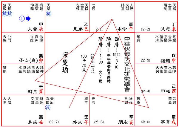 今年(2012年2月4日之前 皆為辛卯年)宋先生流年歲宮在身疾宮,宮中居太陽、太陰,加逢文昌、文曲,是非常好的運勢。雖然大運尚在62~71的不良情勢中,但必然有所斬獲,能在後年72~81的大運之前打開一道曙光,宋先生72~81的大運正是今年流年的宮位,「人生七十才開始」這句名言,對他非常適用。傳統紫微鬥數辛年文昌化忌,其實隻有十四主星有四化,辛年應是七殺化忌,今年宋先生七殺化忌於本命宮,與大運的武曲化忌對沖,這是很特殊的現象,代表他今年非常偏執而且耗損,有跳脫不出的旋渦讓他全力以赴,由於歲宮文昌、文曲加持,會讓他有出象的表現吧!無論如何,後勢看好。請參考下附之命圖,自能有所體會,爾後運用到自己的命圖上。